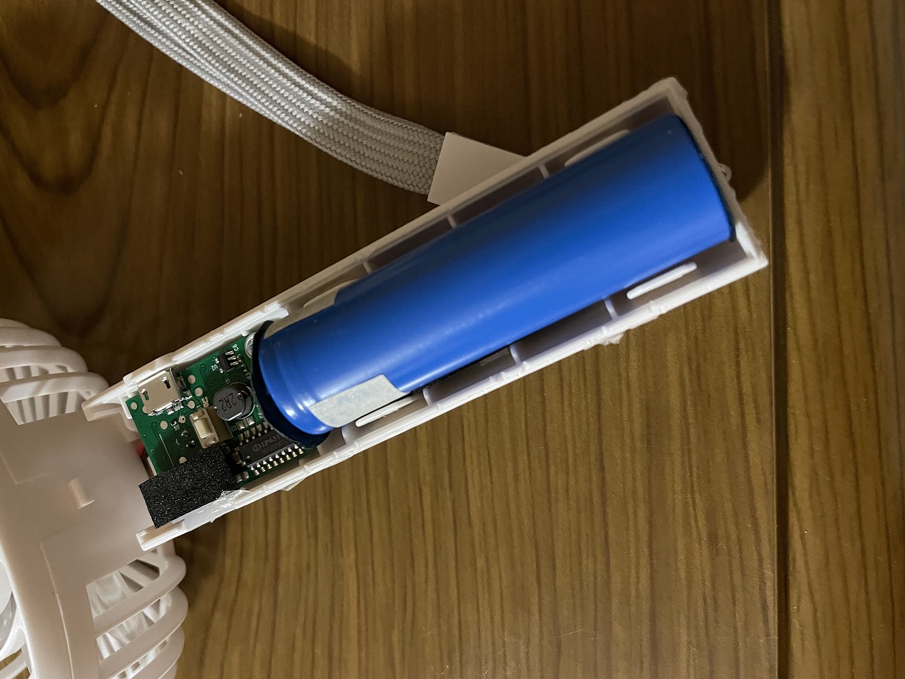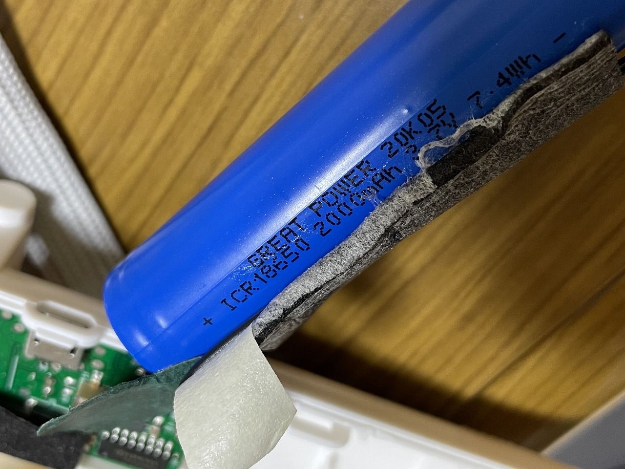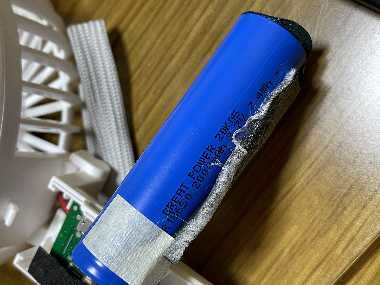 18650リチウムイオンバッテリー、保護回路無しの生セルなので分解はかなり危険。取り扱いを誤ると即座に発火するタイプ。